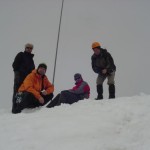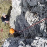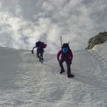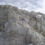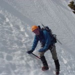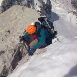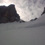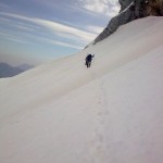Dobili smo se v soboto, 23.4., ob 7ih pred klubom in odbrzeli preko Trbiža do Sella Nevea, znanega italijanskega smučišča, ki stoji na drugi strani Kanina. Do sedla na 2000m smo uporabili gondolo in si s tem prihranili precej dragocenega časa. Klub temu nas je čakalo premagovanje še 400-tih metrov višine. Od zadnje postaje gondole na italijanski strani smo krenili po trdem, zmrznjenem snegu skoraj po ravnem do prve širše grape. Dostop na Lopo iz italijanske smeri je bil lažji, saj je v tem času na severni strani še dovolj snega in grapa na greben prihrani marsikateri skalni skok na slovenski strani, ki je skoraj povsem kopna. Zadnjih skokov pa se ni dalo izogniti in nas tako nas je čakalo nekaj plezarije III. stopnje.